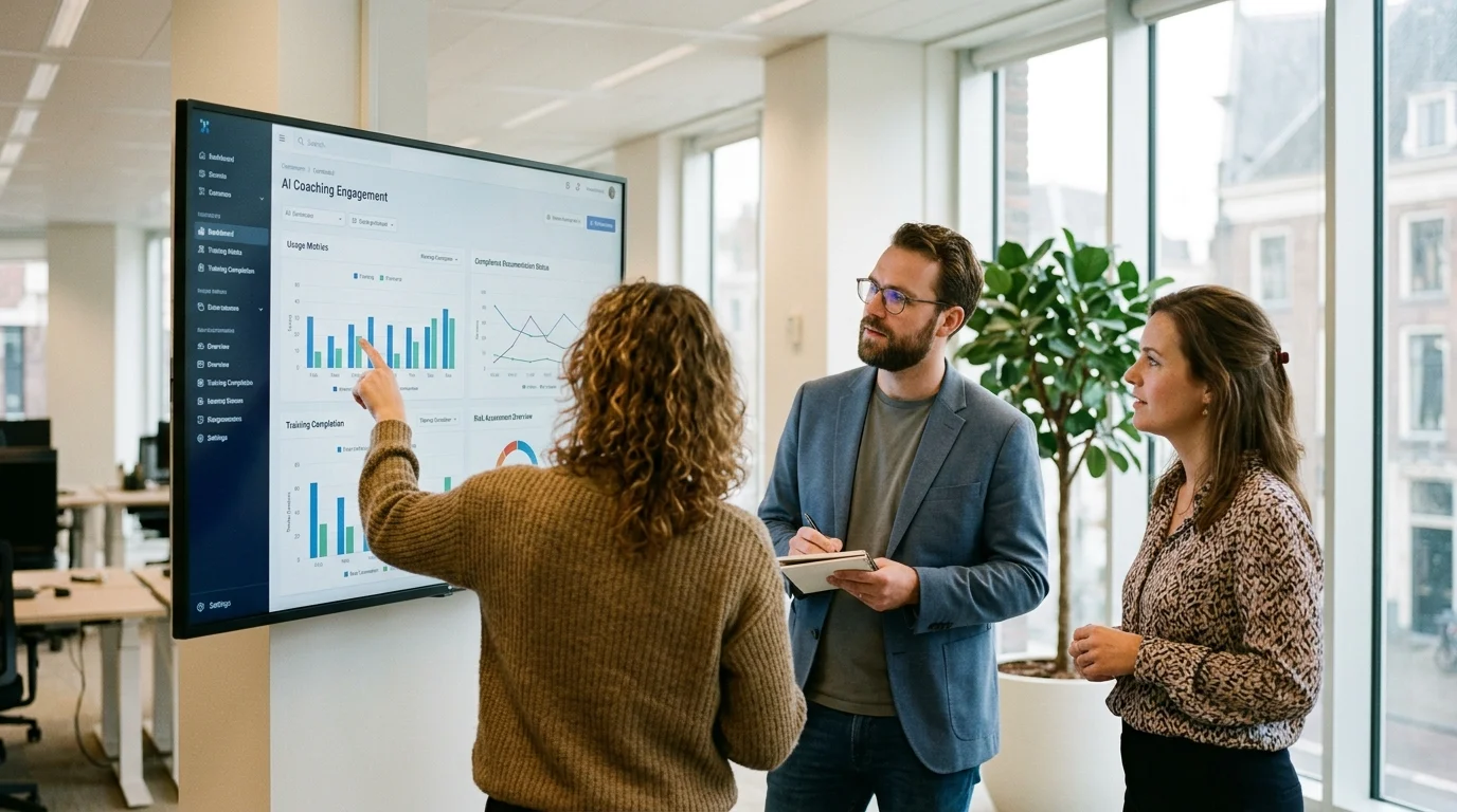 AI coaching werkt het beste als aanvulling op menselijke training, niet als vervanging. De meest succesvolle implementaties hebben een feedbackloop: medewerkers oefenen met AI, trainers zien waar mensen vastlopen, en passen groepssessies aan op basis van patronen.